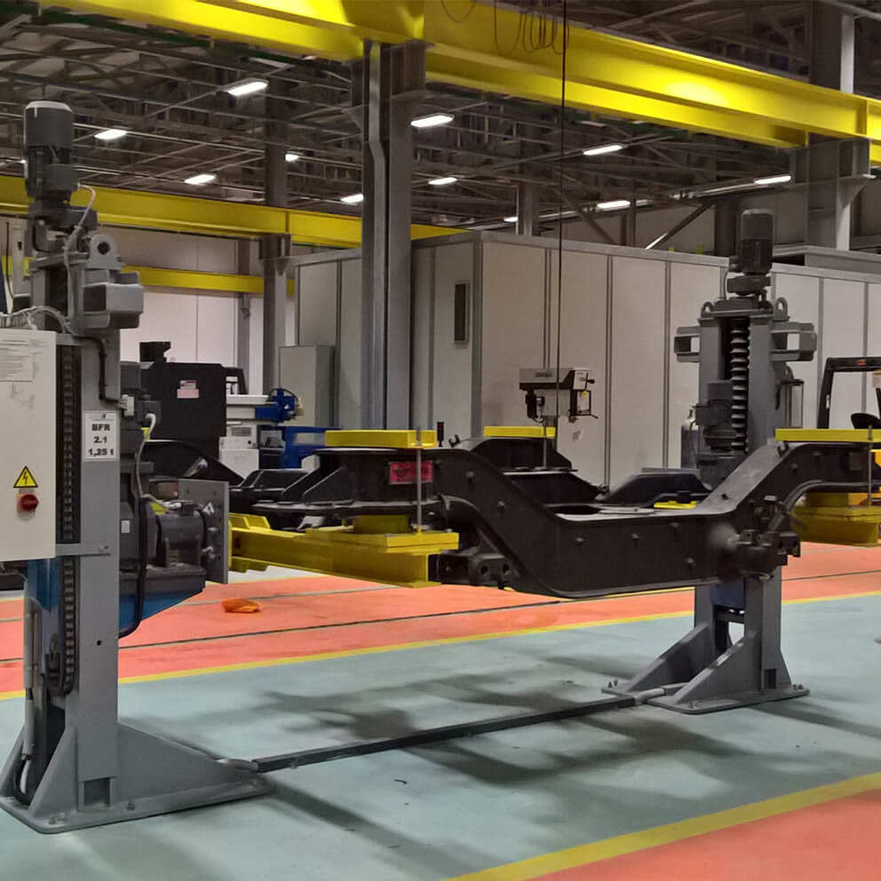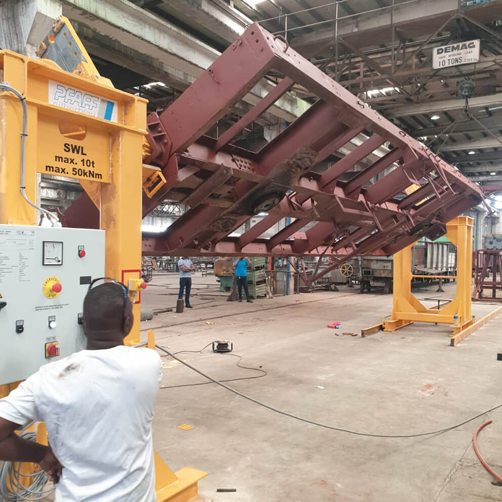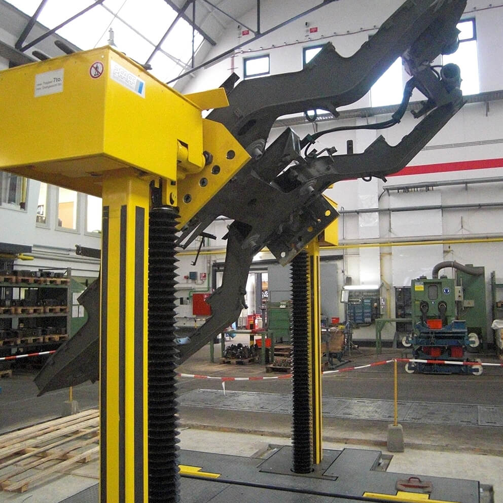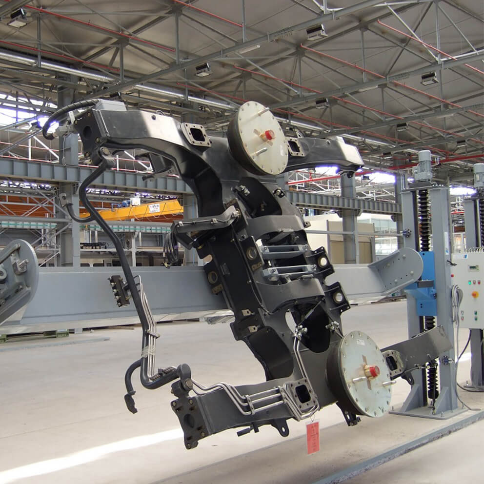 The Bogie Lift & Turn Device is specifically designed to ensure that bogies and their components are always positioned for optimal maintenance and repair work. By providing an ergonomic working position, this system significantly enhances both the comfort and safety of technicians, reducing fatigue and improving productivity.