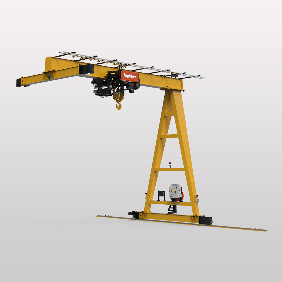 One end of the crane runs on the rails installed on the gantry and the other end having a leg runs on the floor without guide rails. This eliminates any floor level obstacles.
