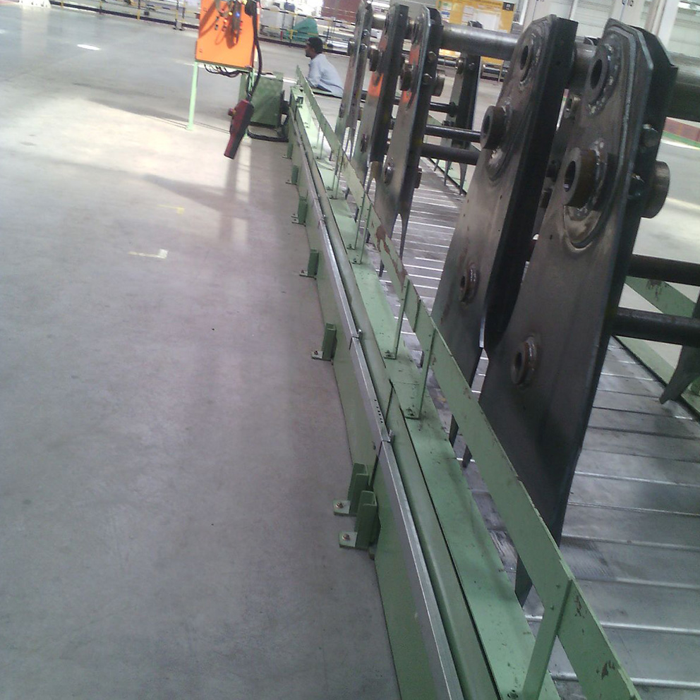 Conveyors have slats attached to the double strand steel side bar bushed roller chains and are available in all practical widths, lengths and heights. Variable speed is possible for achieving desired cycle time.